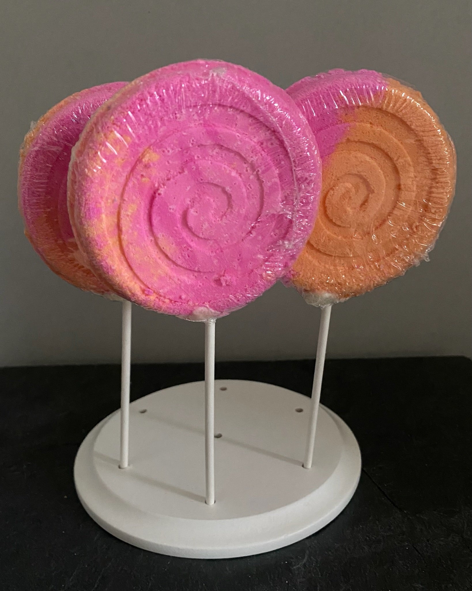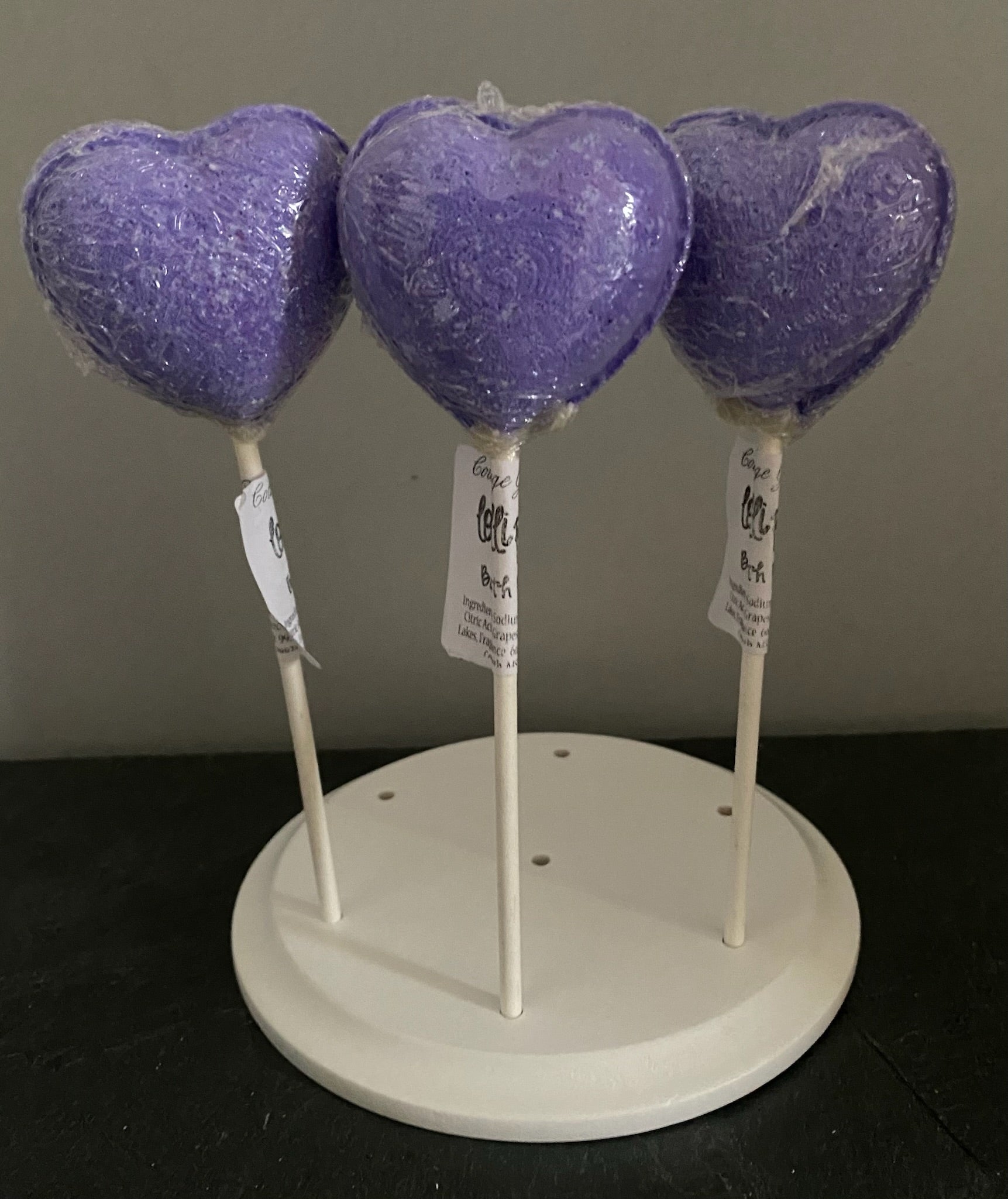 Petite gourmandise à mettre dans son bain. Contient de l'huile de pépin de raisin qui hydrate votre peau. Le bâton de la sucette est fixé grâce à du beurre de karité.